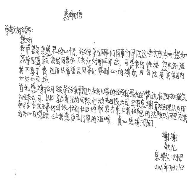 经过半个月治疗休养,刘军手部已无大碍。出院后的他写了一封感谢信并为公司送了一面锦旗,他说道,是必一运动·(B体育-Bsports)官方网站这个大家庭让他感受到了关怀和温暖,他表示要把这种关怀变成工作上的动力,争取早日返回工作岗位,努力工作,回报大家的关心和关爱。